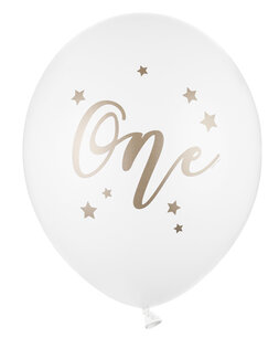 Pastel witte ballon met de tekst One, afmeting 30cm. Geschikt voor helium. Prijs is per ballon, vanaf 10 stuks met korting. Lees meer