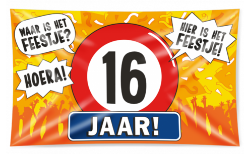 Extra grote vlag met een verkeersbord 16 jaar! Afmeting 150 x 90 cm. Materiaal: stevig polyester. met koordjes aan alle 4 de hoeken. Lees meer
