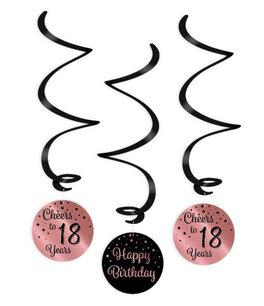 Mooie swirl hangdecoratie in rose gold met zwart. Tekst: 1x Happy Birthday en 2x Cheers to 18 years. Afmeting: 14 cm diameter, lengte ci. 70 cm. Materiaal: papier/plastic. Lees meer