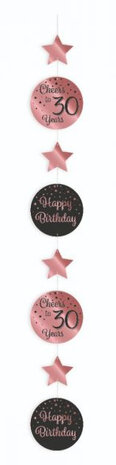 Eigentijdse hangdeco uit de Rose/Black collectie. Rose gold met zwart; voor elke verjaardag die in stijl gevierd wordt. Deze hangdeco, met sterren ertussen, is maar liefst 1,2 m lang. Het is dubbelzijdig bedrukt in zwart met de tekst: Happy Birthday, en 2x in rose gold met Cheers to 30 years.