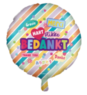 Iemand bedanken kan ook met een folieballon. Deze eigentijdse, vrolijke ballon is wit met zachte kleuren en de tekst Hartstikke Bedankt, Merci, Grazi, Merci, Danke