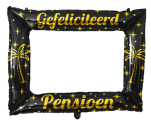 Creëer onvergetelijke momenten op het afscheidsfeest voor de collega. Selfies met deze photo frame folieballon zijn een super leuke blijvende herinnering. Zwarte rechthoek met gouden tekst Gefeliciteerd Pensioen, met sterren en palmbomen bedrukt.