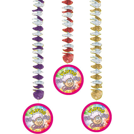 50 worden is een perfecte gelegenheid om lekker uit te pakken met vesieringen. Deze spiraal decoraties passen daar goed bij. Maar ook als je het klein viert, is dit een goede keuze. Het betreft een set met 3 decoraties met vrolijk gekleurde afbeelding.