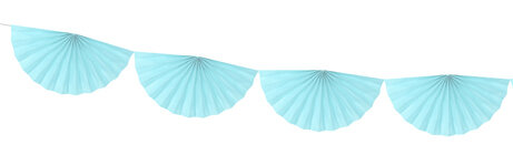 Papieren slinger, 3 meter lang. In de vorm van een waaier. Kleur: lichtblauw. De waaiers hebben een diameter van 40 cm. Lees meer
