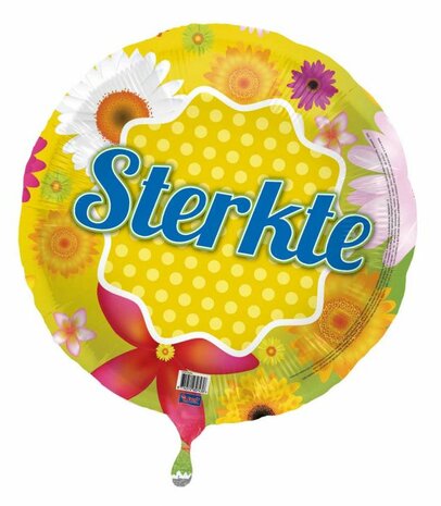 Folieballon met tekst 'Sterkte'. Rond met lieve bloemenprint.