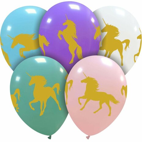 Schattige ballonnen voor je Unicorn party: pastel ballonnen met mooie gouden Unicorn afbeelding, rondom bedrukt.